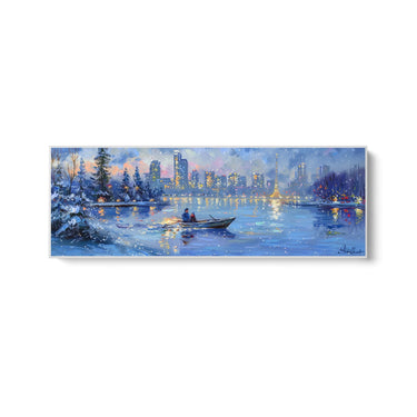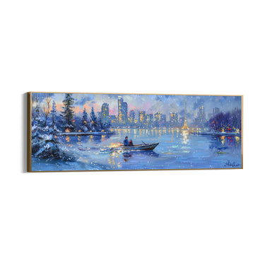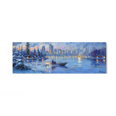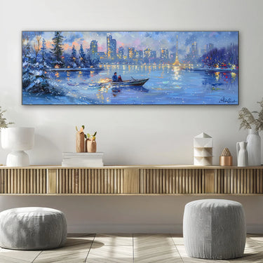 Målningen "Reflexer Under Snön" är en fantastisk tryck på duk som fångar magin av en vinterkväll. Scenen skildrar ett snöigt stadslandskap, med upplysta byggnader som speglas i de lugna vattnen i en sjö. I centrum av verket navigerar en ensam båt mellan de glittrande reflexerna, vilket tillför en känsla av lugn och ensamhet till kompositionen.