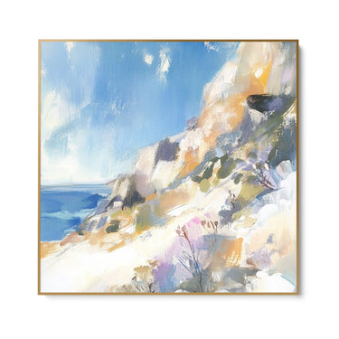 Denna canvastavla föreställer ett hisnande kustlandskap. Scenen fångar en klippa som blickar ut över ett lugnt och stilla hav. De mjuka och skiftande penseldragen framkallar känslan av en lugn och ljus dag.