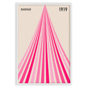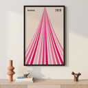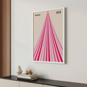 De dominerande färgerna i affischen är olika nyanser av rosa och fuchsia på en beige bakgrund. De vertikala linjerna, som varierar från ljusrosa till intensiv fuchsia, tillför djup och dynamik till bilden.