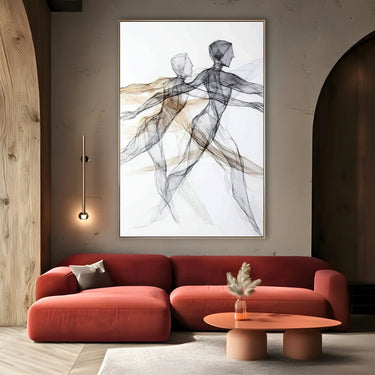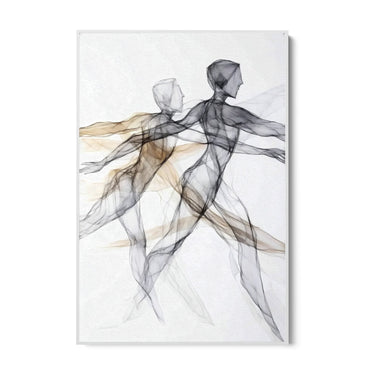 Denna canvastavla, med titeln "Inre Rörelse", fångar essensen av dynamik och flöde genom användning av mjuka och suddiga linjer. Två mänskliga figurer, skisserade med lätta och transparenta drag, verkar dansa i en harmonisk balans och framkallar en känsla av ständig och sammanlänkad rörelse.