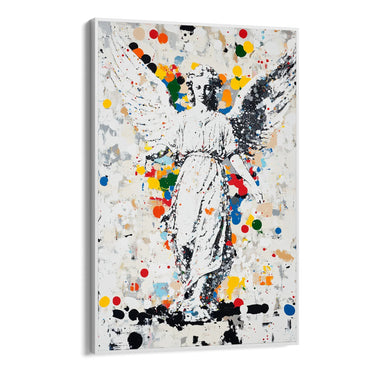 Målningen kännetecknas av en explosion av livfulla färger som står ut mot den vita bakgrunden. Fläckar av rött, gult, grönt, blått och svart skapar en dynamisk och modern kontrast, vilket tillför djup och rörelse till verket. Dessa vibrerande färger tycks dansa runt ängelns figur och framhäver dess himmelska närvaro.