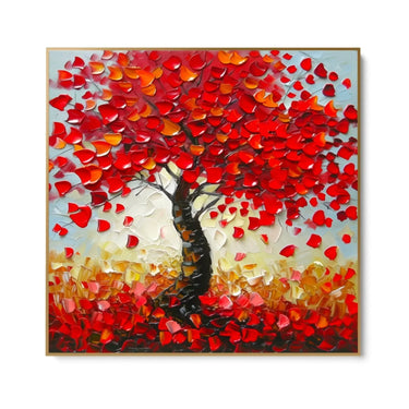 De dominerande färgerna i detta canvastryck är lövens röda och orangea färger, som överför värme och vitalitet. Trädets stam är målad i mörka toner, vilket skapar en stark kontrast med de ljusa löven. Bakgrunden använder ljusa nyanser av blått och vitt, vilket ger djup och ljusstyrka till hela kompositionen.