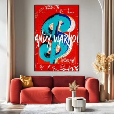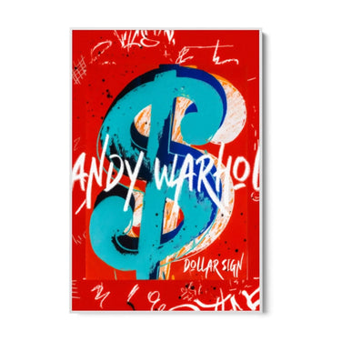 "Warhol Dollar Sign"-målningen är ett canvastryck som fångar essensen av Andy Warhols ikoniska popkonststil. I mitten av kompositionen framträder ett stort dollartecken ($) i klarblått, omgivet av nyanser av orange och vitt.